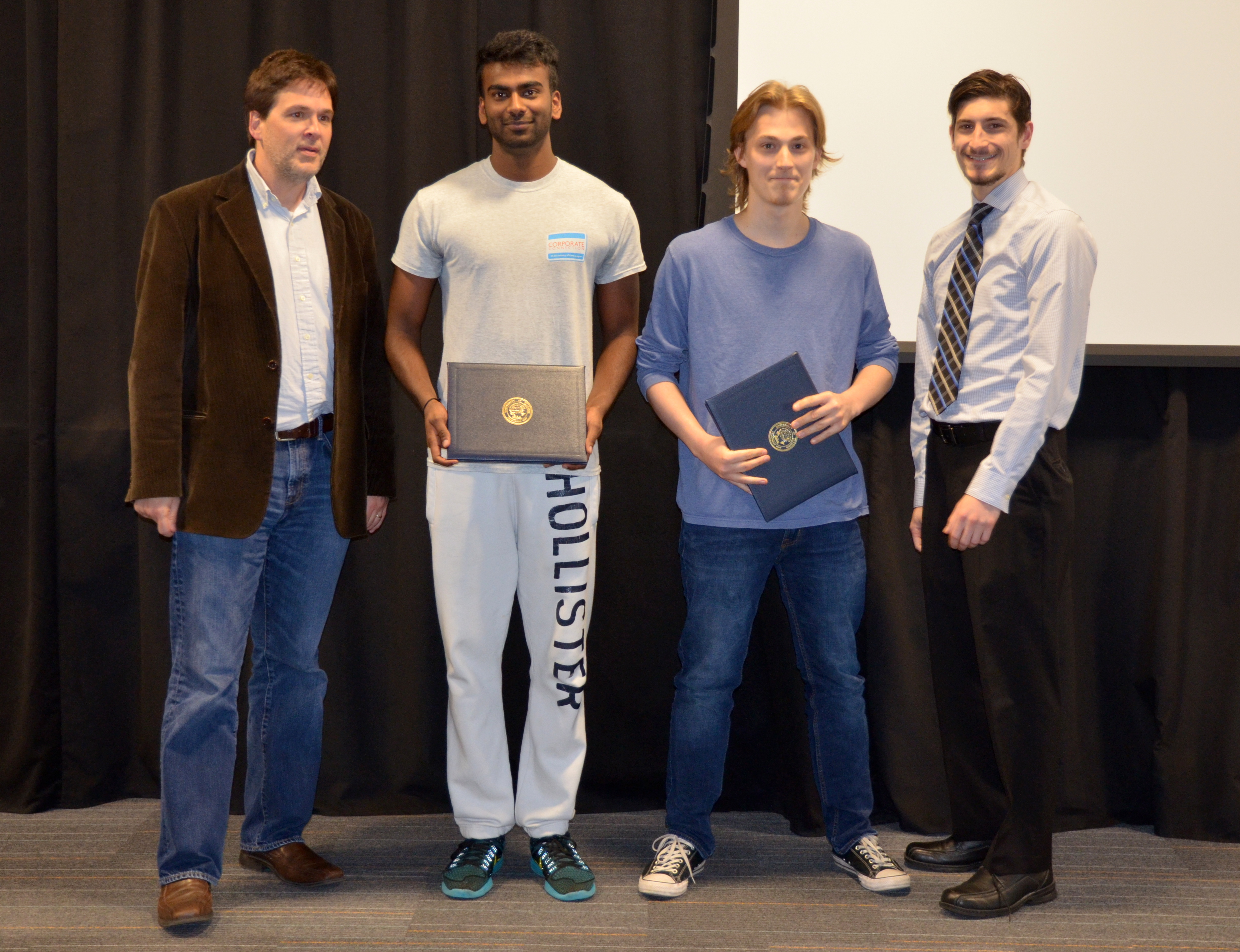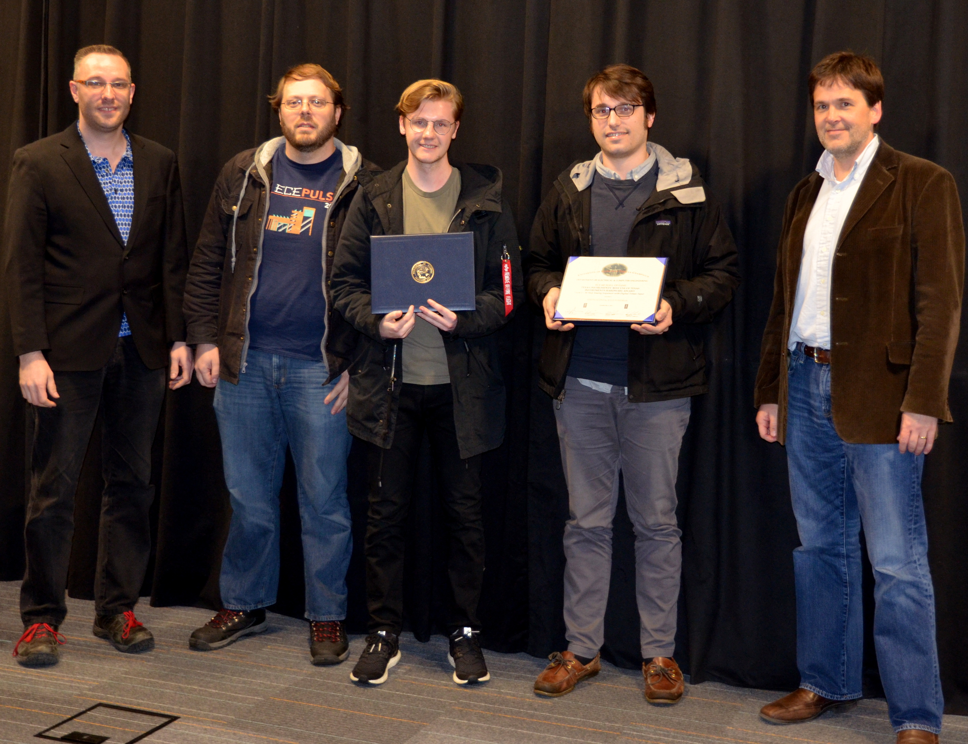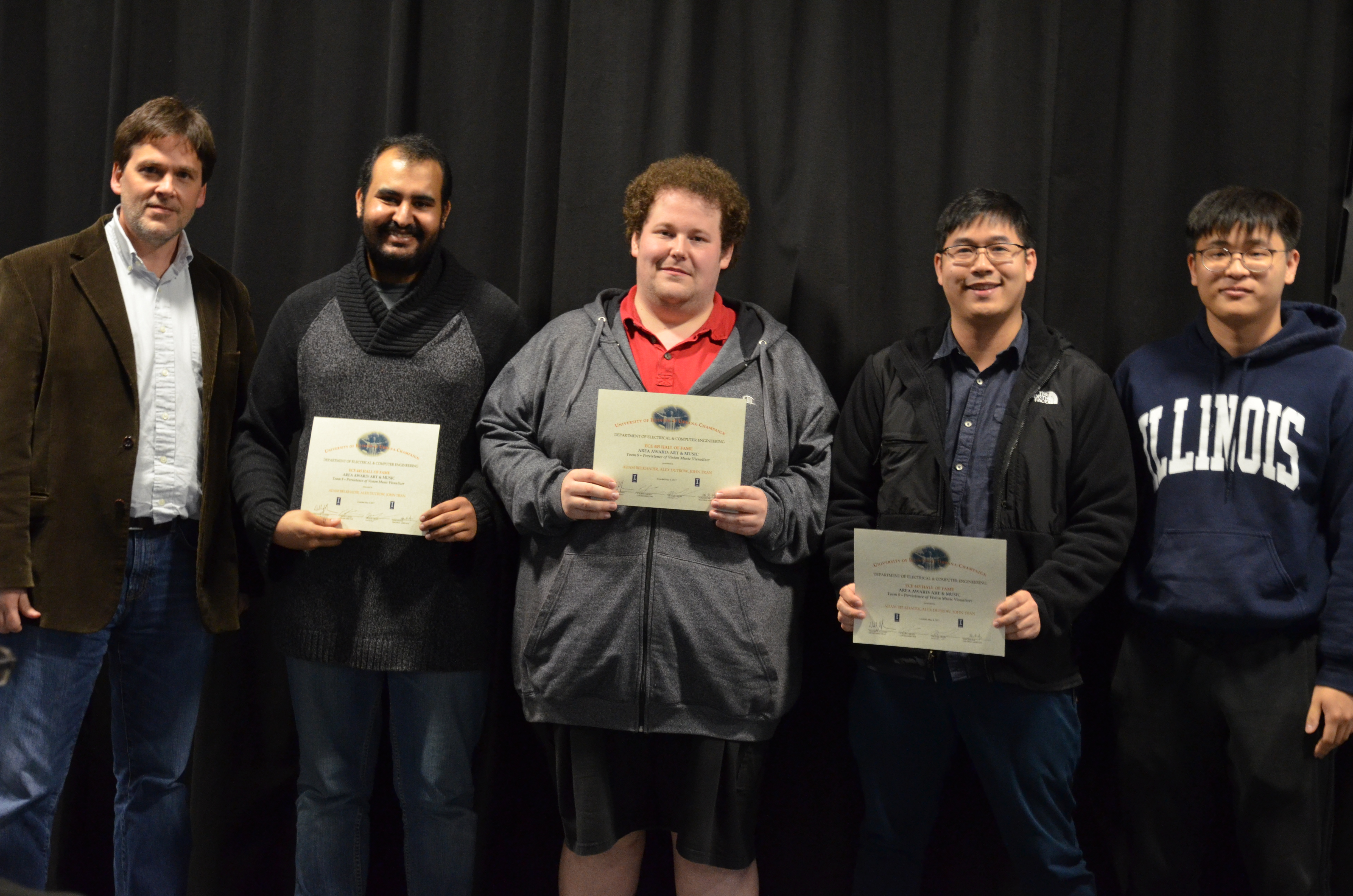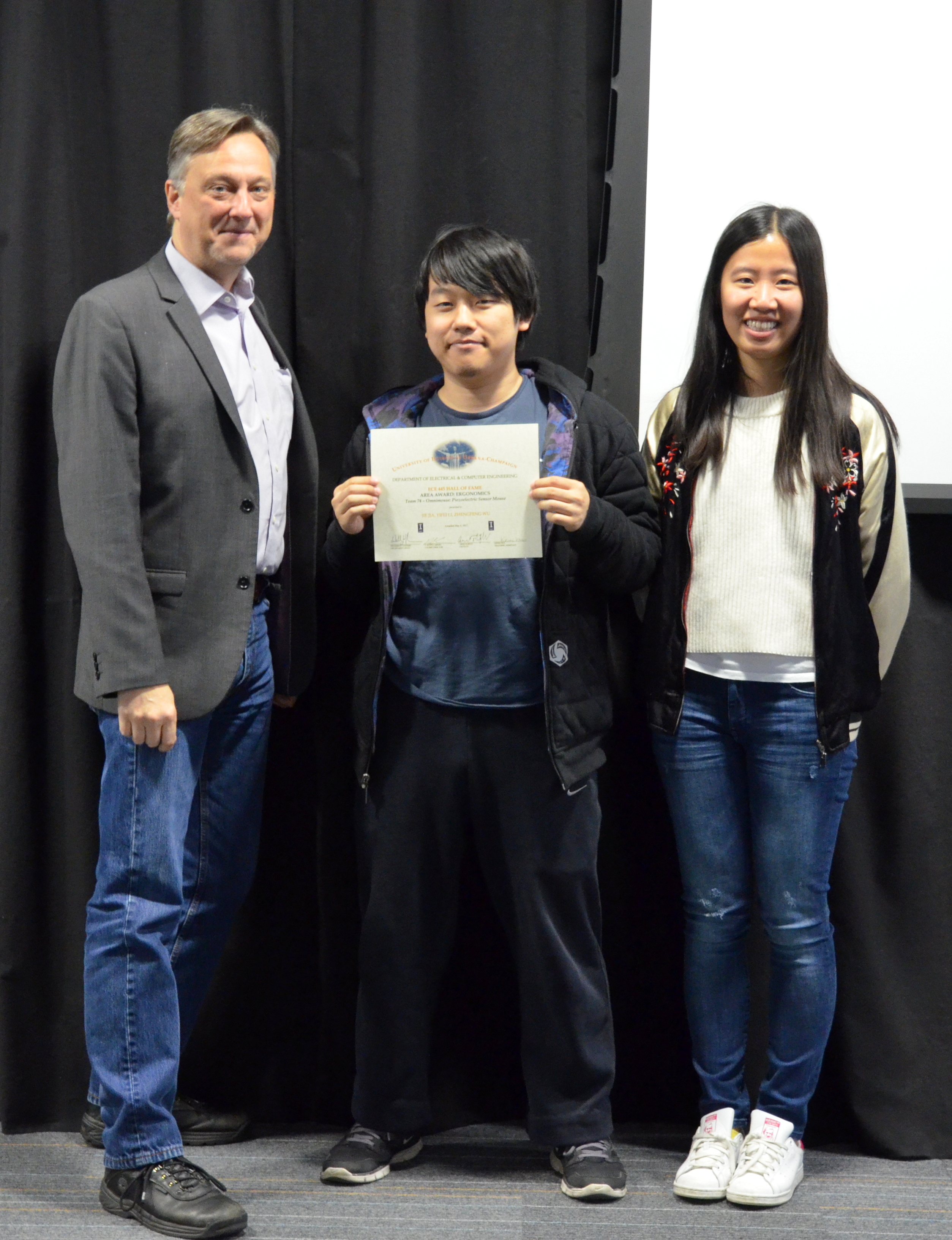 The ECE445 - Senior Design Project Lab marked the end of the semester with an awards presentation. The course helps seniors make the transition into the industry through self-chosen team projects. Students have the opportunity to apply the skills and knowledge gained from previous courses and experiences, develop teamwork and leadership skills, and gain in-depth practical knowledge in a topic they are passionate about. The students receive guidance and support from faculty and TAs. Professors Paul Scott Carney, Arne Woolsey Fliflet, Seth Andrew Hutchinson, Michael L Oelze and Karl Edward Reinhard led the lab in Spring 2017.
