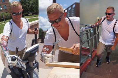 A patient performs various everyday tasks with a sensory control module integrated with his prosthetic arm. Photos courtesy of Aadeel Akhtar