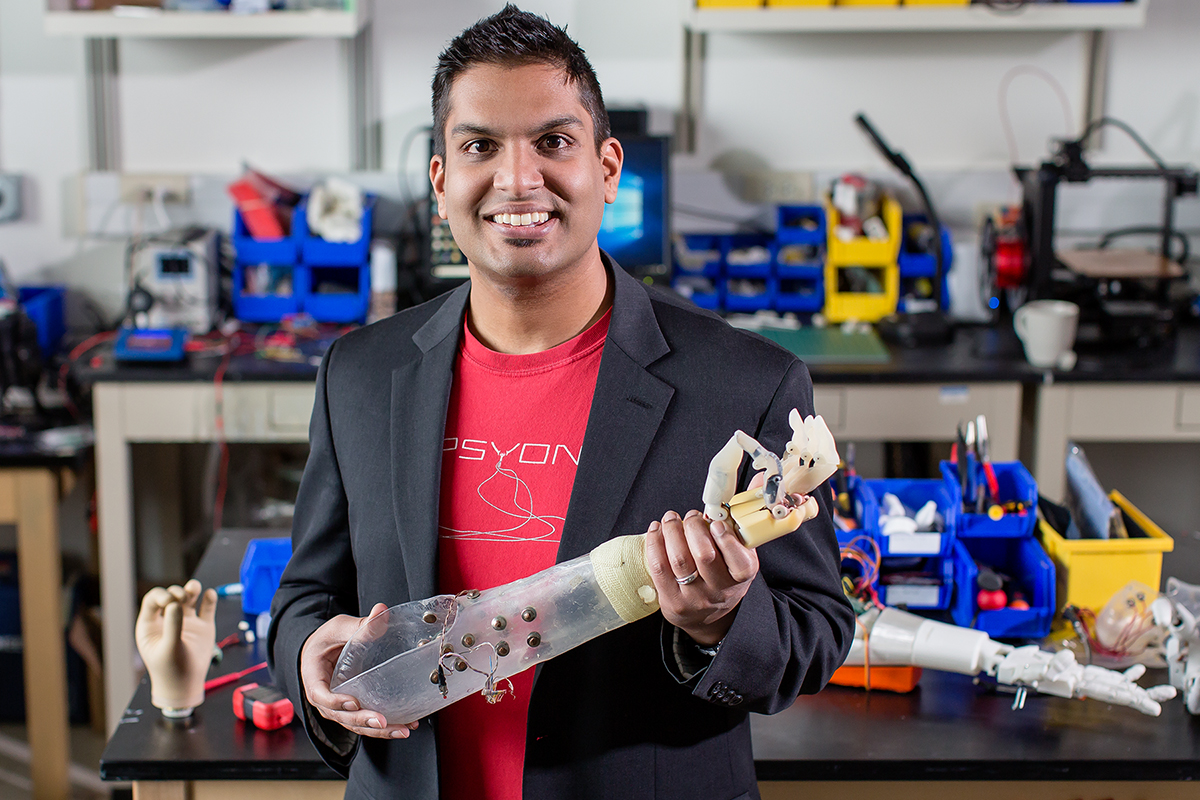 Aadeel Akhtar, an M.D./Ph.D. student at Illinois, developed a control algorithm to give prosthetic arm users reliable sensory feedback. Photo by L. Brian Stauffer