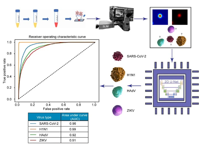 They introduced the AI program to a pair of images: a stained SARS-CoV-2 particle producing fluorescence, and a phase image captured with a fluorescence-SLIM multimodal microscope. The AI is trained to recognize these images as one and the same. Easily recognizable, the fluorescence-stained image functions like training wheels; with enough repetition, the machine learns to detect the viruses directly from the SLIM, label-free images without the added support.