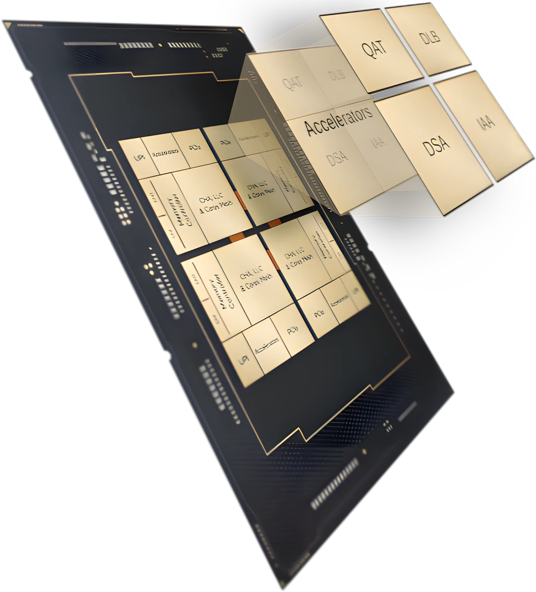 Intel's new Sapphire Rapids datacenter processor, highlighting the four on-chip accelerators