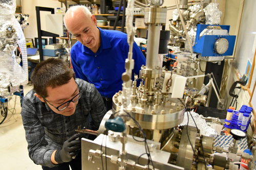 Postdoctoral researcher Gang Wang loading a sample into the system used to perform the nanotube crosslinking operation while Joseph Lyding looks on.