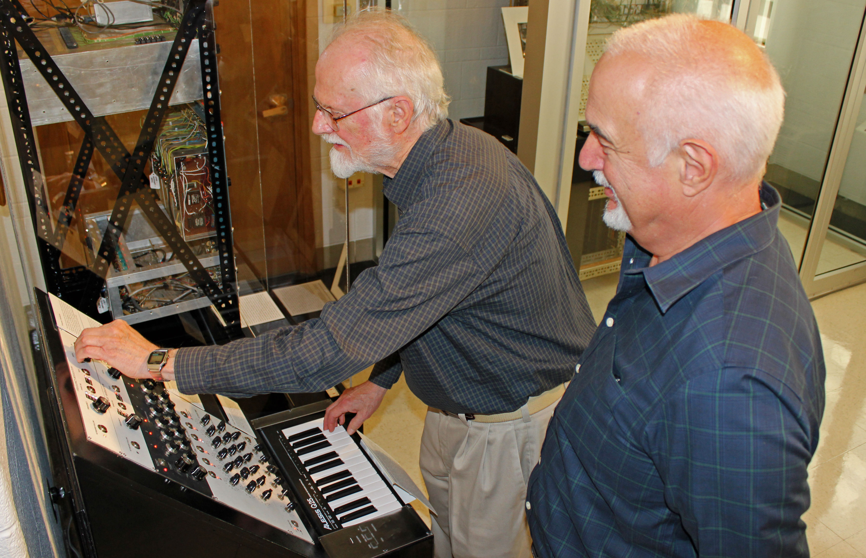 The day began with a demonstration of the Continuum Fingerboard by its inventor, ECE lecturer Lippold Haken. Emeritus professor Jim Beauchamp then escorted Hildebrand to the University Library’s Sousa Archives and Center for American Music, where a functioning recreation of Beauchamp’s early synthesizer, the Harmonic Tone Generator, is on display next to Salvatore Martirano’s legendary Sal-Mar Construction. The tour ended with a visit to the School of Music’s historic Experimental Music Studios, founded in 1958 by the first composer of computer music, Lejaren Hiller.